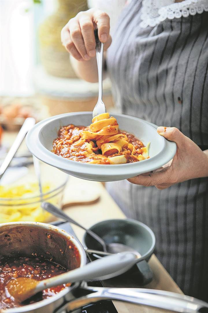 Kook pasta volgens die aanwysings op die verpakking. Verhit die olie in ’n pan oor medium hitte. Voeg ui by en soteer vir 2 minute. Voeg dan die wortels, seldery en roosmaryn by. Soteer vir 3-4 minute.
