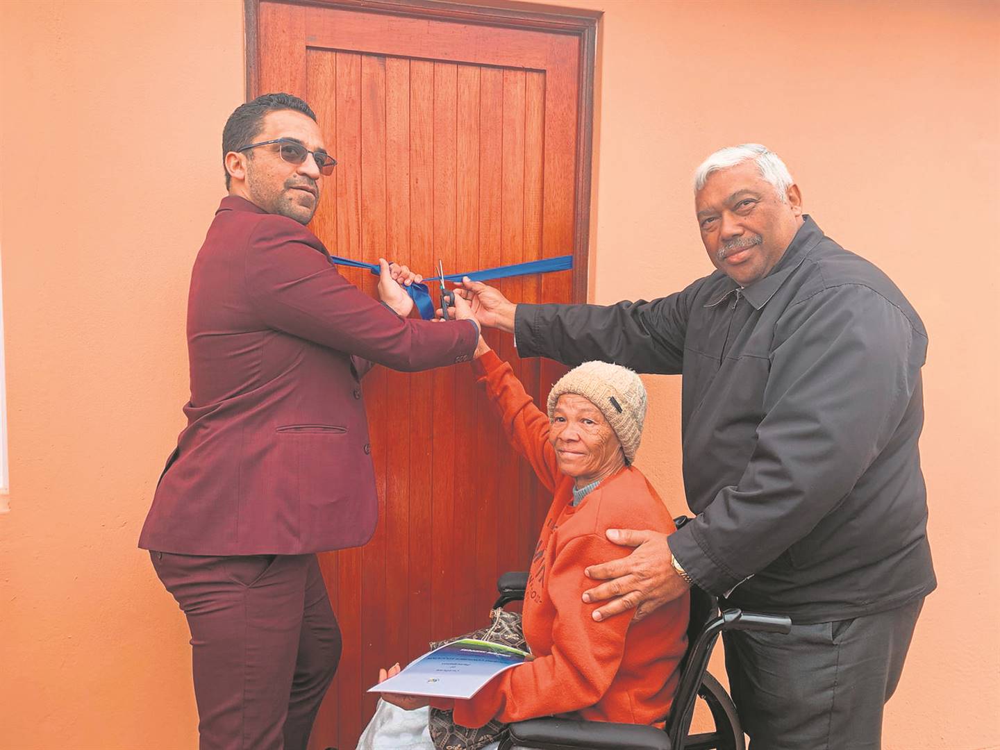 Die Wes-Kaapse minister Tertius Simmers (links) en Ray van Rooy, die Bergrivier-munisipaliteit se burgemeester (regs), by die 74-jarige Tryntjie Engelbrecht voor haar nuwe huis. Foto: Melt Botes