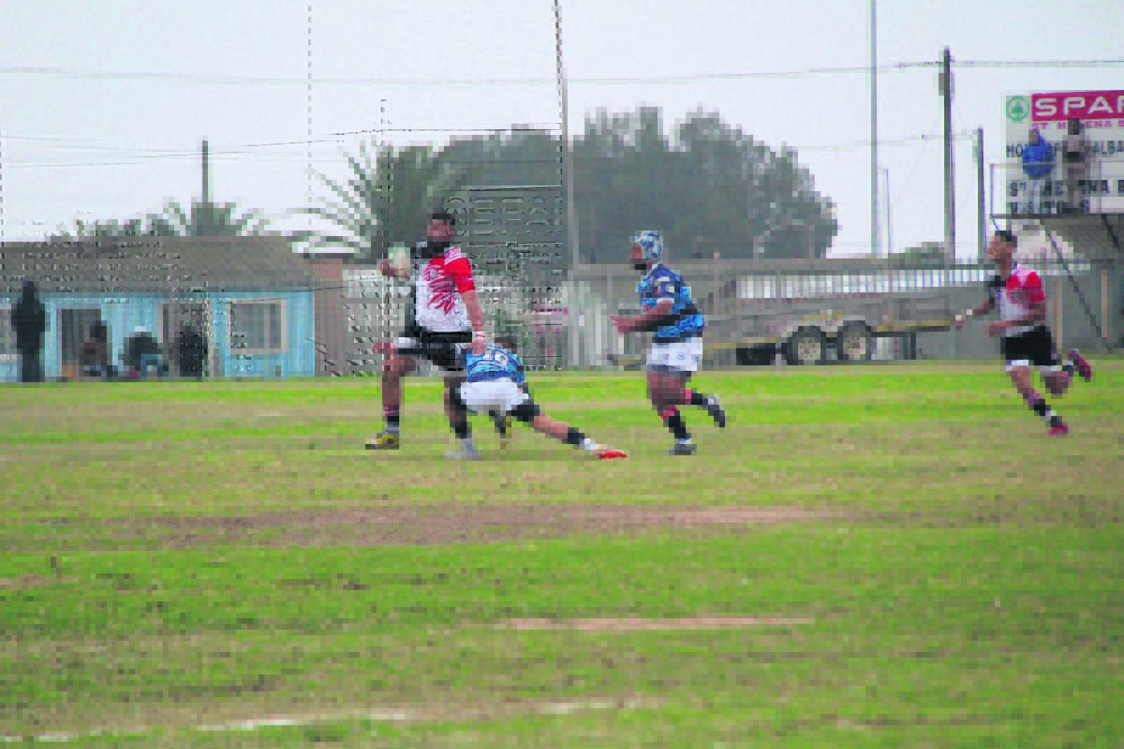Grantville Arendse, die agtsteman van St. Helenabaai, hardloop met die bal in die hand in sy span se wedstryd op sy tuisveld Saterdag teen Velddrif. St. Helenabaai het dié opwindende wedstryd naelskraaps gewen. Foto’s: Noluvu Ludidi