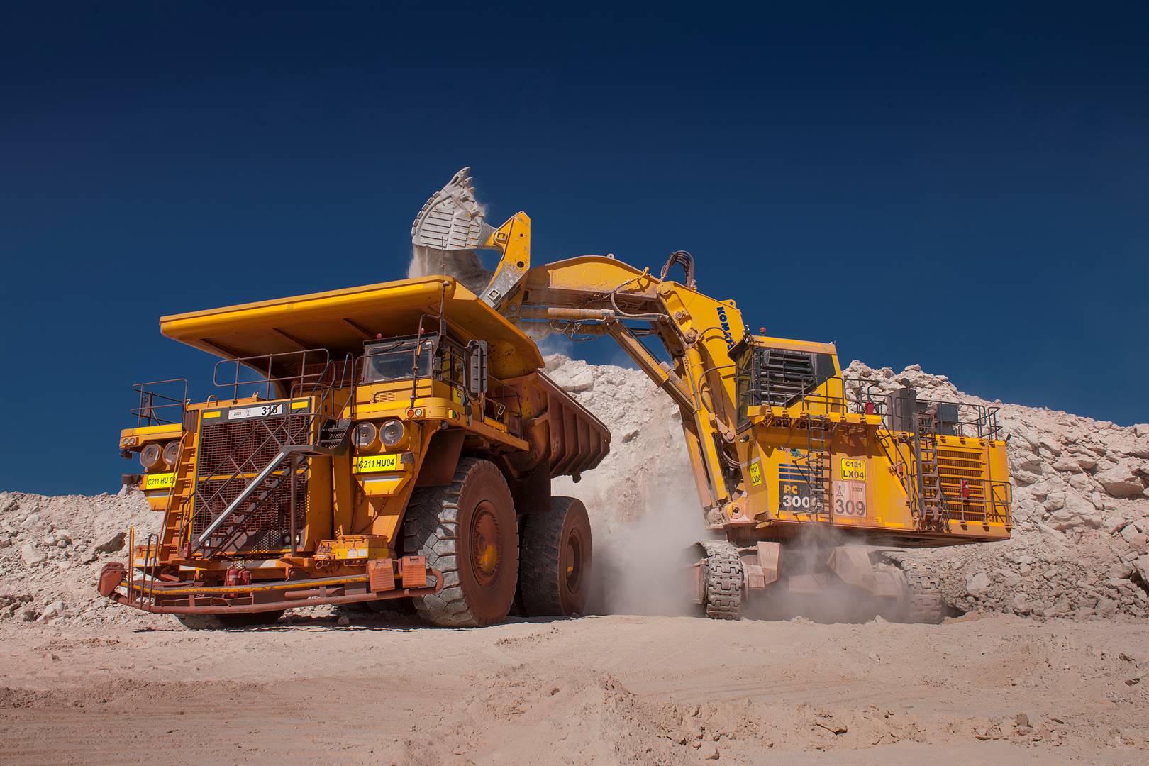 Mynmasjinerie aan die werk by Kumba se Sishen-myn naby Kathu in die Noord-Kaap. Foto: Kumba