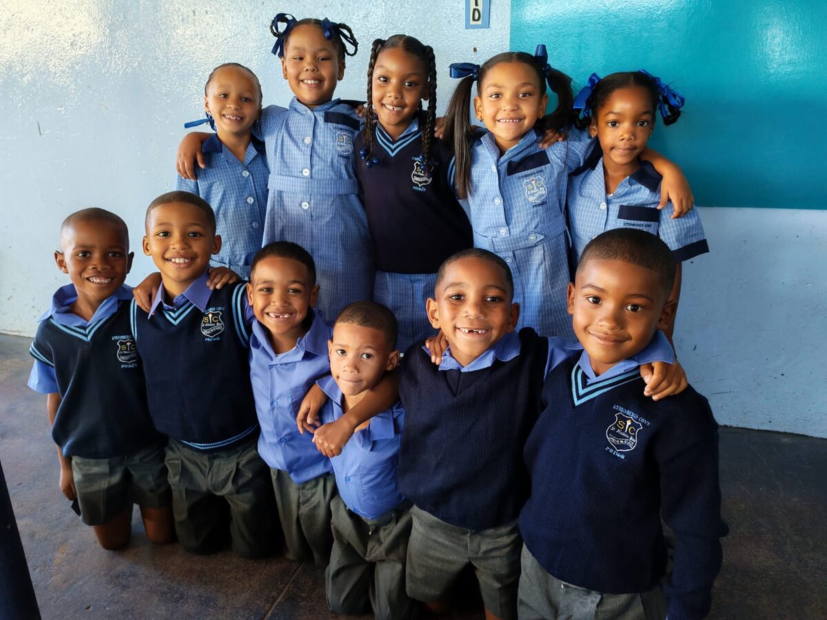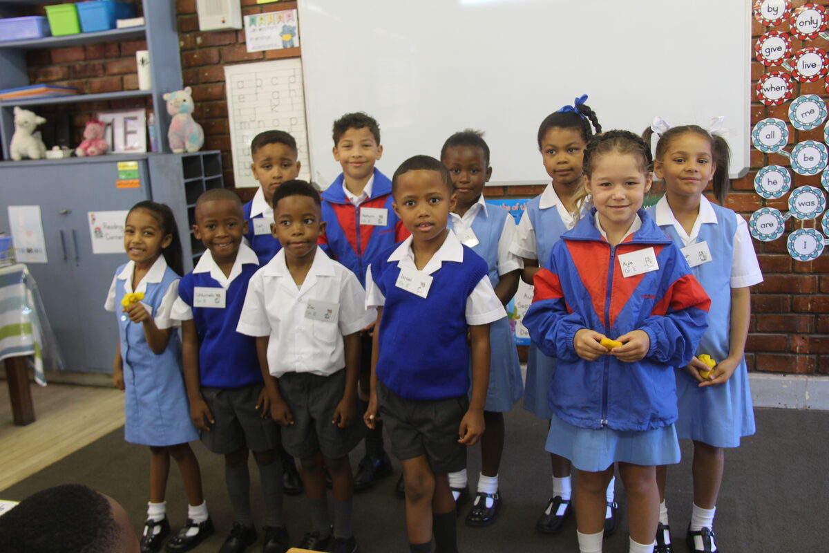 Nuwe maatjies – die gr.1-leerders van St. Helenabaai Primêr is Sharne Esau, Zarah Wilsnach, Amorelle Claassen en Faith Samaai. Voor: Ethan van Zyl en Raywin Adams.