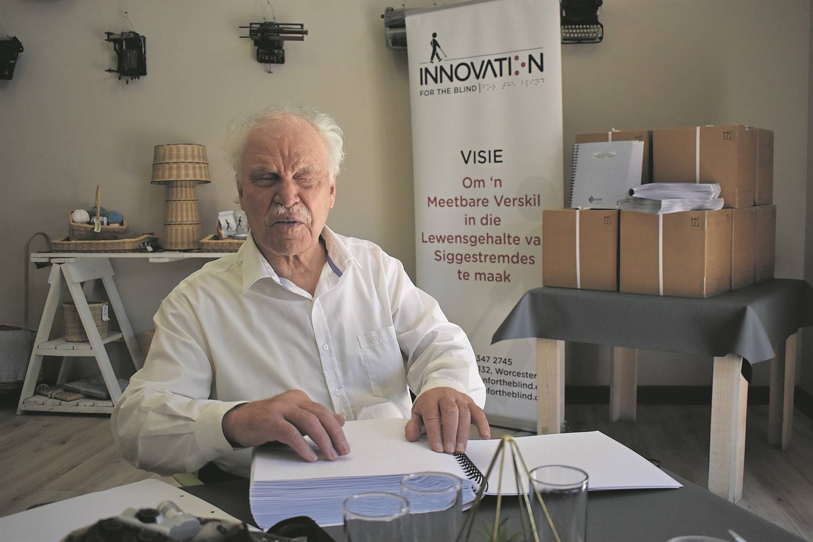 Die eerste 2020- Afrikaanse Bybelvertaling in Braille is Dinsdag 15 November by Innovation for the Blind se hulpbronsentrum bekend gestel. André Steyn, ’n Worcesteriet en inwoner by Innovation for the Blind, het die eerste Afrikaanse Braille-Bybel by die bekendstelling ontvang. Die Bybel is gedruk deur Pionierdrukkery en die finansiering vir die meesterkopie is van die NG Kerk in SA ontvang, terwyl die drukwerk van die kopie deur die Bybelgenootskap in die Wes-Kaap geborg is. Die Bybel bestaan uit 7 900 bladsye en is op bestelling beskikbaar by Pionierdrukkery Worcester by 023 342 6313.Foto: Jana Scheepers