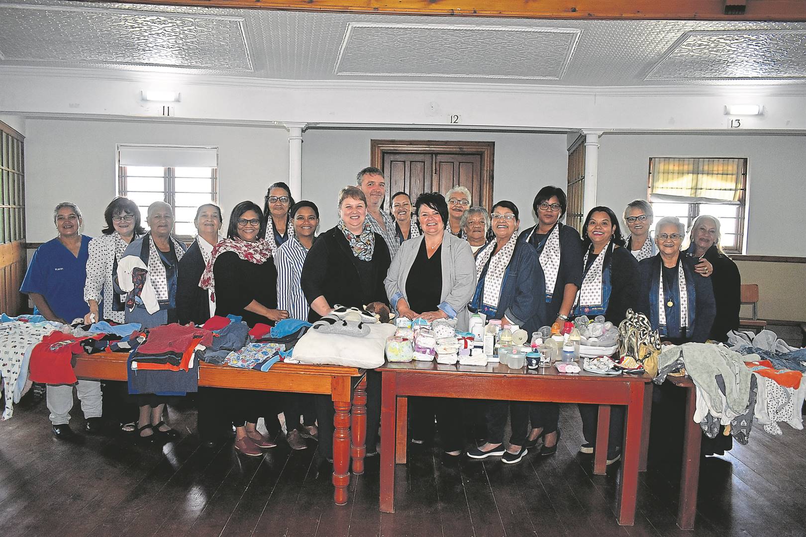 Die plaaslike organisasie Wêreld-biddag vir vroue het talle stukke babaklere en -produkte onder mekaar en uit die gemeenskap ingesamel en dit aan die plaaslike Baby Saver-organisasie oorhandig. Hulle sal dit met die Thuthuzela Care-sentrum deel, wat vroulike slagoffers van geweld asook soms kinders help. Die Baby Saver word by die NG Moedergemeente se pastorie gehuisves. Ds. Carel van der Merwe en sy vrou, Susan, wat ook deel is van die Baby Saver-projek, het die skenkings saam met die BVM-burgemeester, Antoinette Steyn, ontvang. Foto: Tamsyn Jantjies