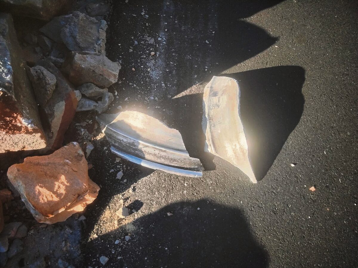 Op foto’s kan gesien word hoe die vragmotor ‘n brug beskadig het, asook ‘n gedeelte van die klipmuur – so erg dat die vragmotor se allooiwiele gebreek het.