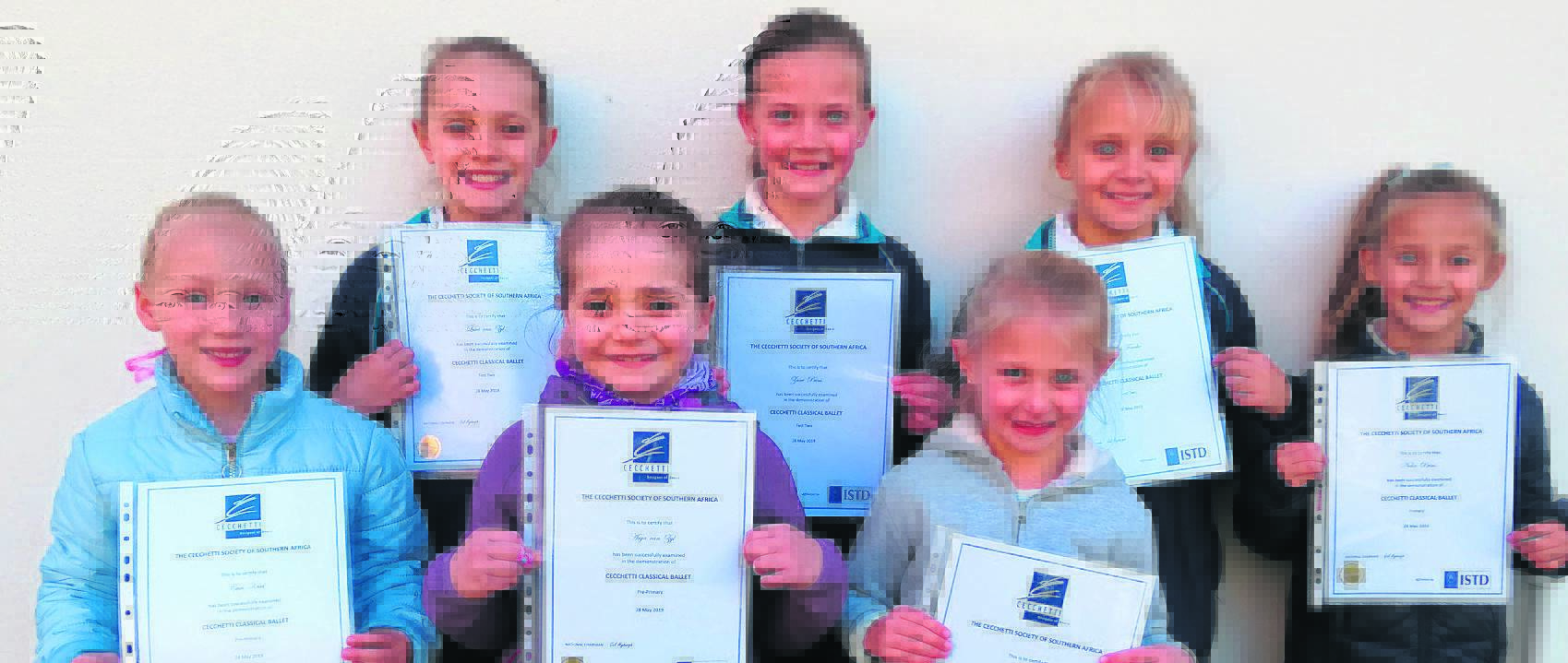 ’n Groepie ballerinas het uitstekend presteer in die Hexrivier Opvoedkundige Sentrum se balleteksamen. Voor staan Cari Kriel (merietetoekenning), Anja van Zyl (onderskeiding) en Olivia Vorster (onderskeiding). Agter is Luca van Zyl (onderskeiding), Zané Prins (onderskeiding), Danica Fouché (onderskeiding) en Nelia Prins (onderskeiding). Foto: