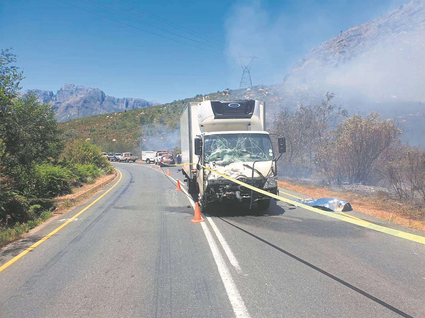 Du Toitskloofpas is Dinsdag vir ure gesluit nadat ’n noodlottige ongeluk tussen ’n motorfiets en ’n vragmotor tot ’n veldbrand gelei het. Lees verder op bl. 2Foto: Ismail’s Towing