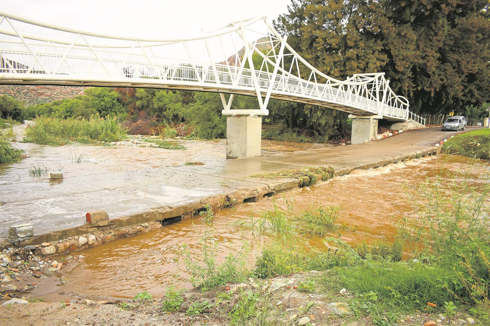 Inwoners van Montagu en omliggende gebiede het Maandag en Dinsdag hul asem opgehou toe stormweer die vallei getref het. Hierdie foto is Dinsdagoggend geneem waar een van die laagwaterbrûe in Montagu so amper onder water was. Die Langeberg-munisipaliteit het ook op sy Facebook-blad gedeel van verskeie paaie en laagwaterbrûe wat in die Langeberg-gebied as gevolg van die swaar reën gesluit was. ’n Inwoner van Montagu het Dinsdagmiddag gesê dit begin plek-plek ooptrek en die reën het opgehou. Volgens hom het dit Maandag liggies begin reën, maar deur die nag het dit hard gereën. Foto: Norman Evertson