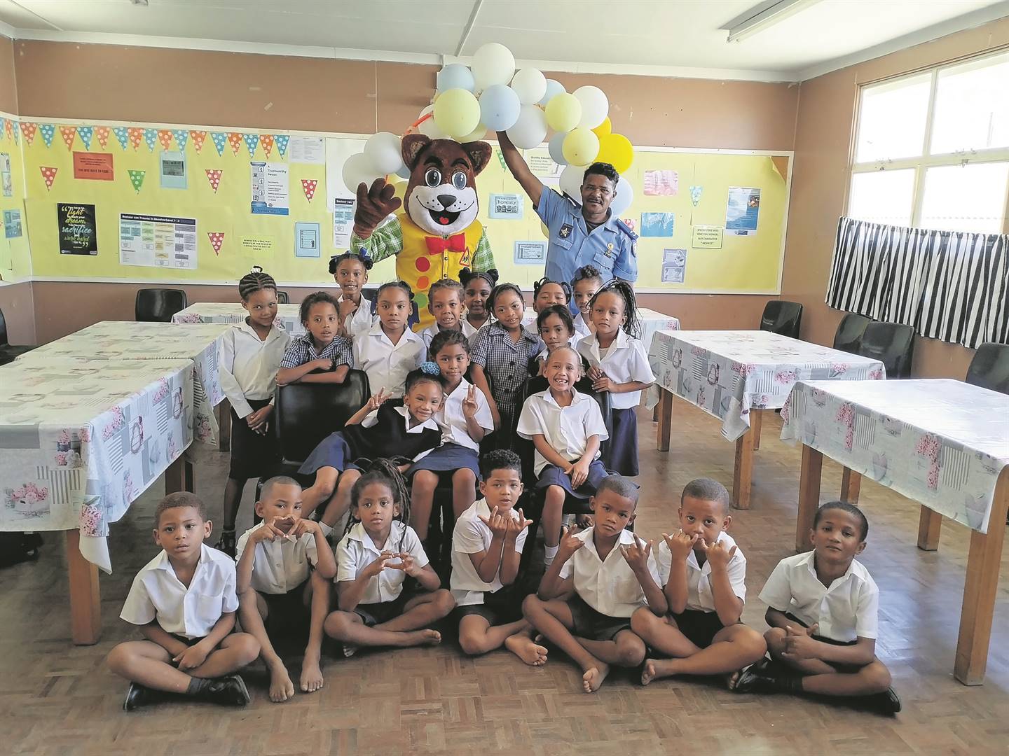 Daantjie Kat het Donderdag by die Laerskool Waveren op Tulbagh besoek afgelê om die gr. 1-leerders in te lig oor padveiligheid. Die leerders het Daantjie Kat verskriklik geniet en op dié manier bewus geword van padveiligheid. Op die foto verskyn Ebrahim Daniels en Daantjie Kat saam met van die skool se leerders.Foto: Peter Luitjies