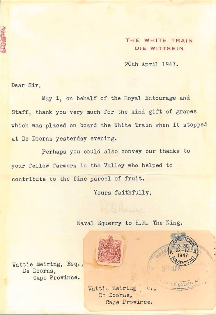 Op 19 April 1947 – ’n week voor prinses Elizabeth se 21ste verjaarsdag is die Wittrein van die noorde weer deur Worcester terug Kaap toe. By Touwsrivier en De Doorns het die trein gestop. ’n Plaaslike boer, Wattie Meiring van Meiringshoop in die Bo-Hexvallei het ’n kissie druiwe aan die koningspaar present gegee. Die volgende dag is daar ’n brief deur die koning se Naval Equerry (vlootstalmeester) op die Wittrein se poskantoor gepos om vir Meiring te bedank. Hierdie brief is vandag in sy kleinkind, raadslid Wouter Meiring, se besit.