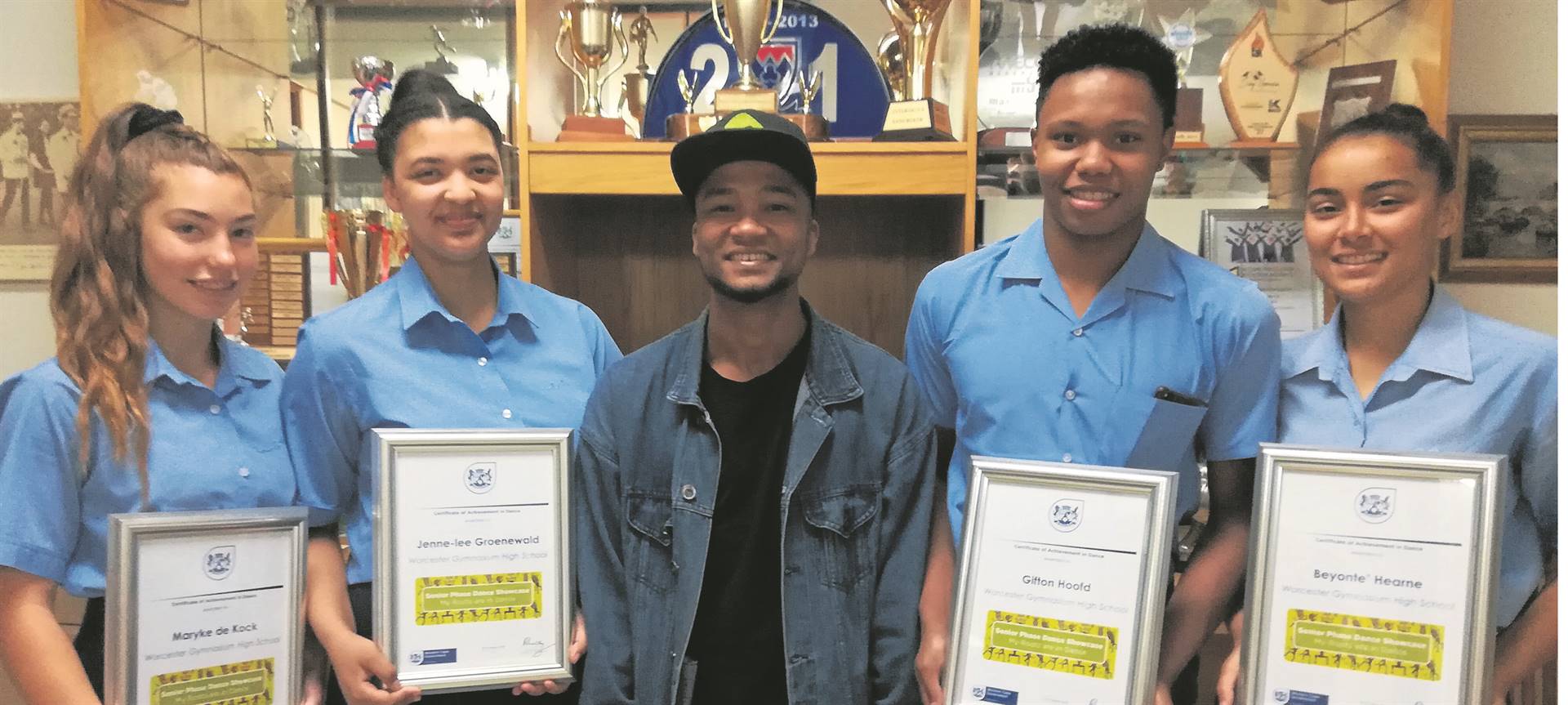 The Western Cape Education Department presented the first Senior Phase Dance Showcase, “My Roots are in Dance”, at Settlers High School. The four learners from Worcester Gymnasium who participated were Maryke de Kock, Jenne-Lee Groenewald, Neakay Seconds (teacher), Gifton Hoofd and Beyonté Hearne. Foto: