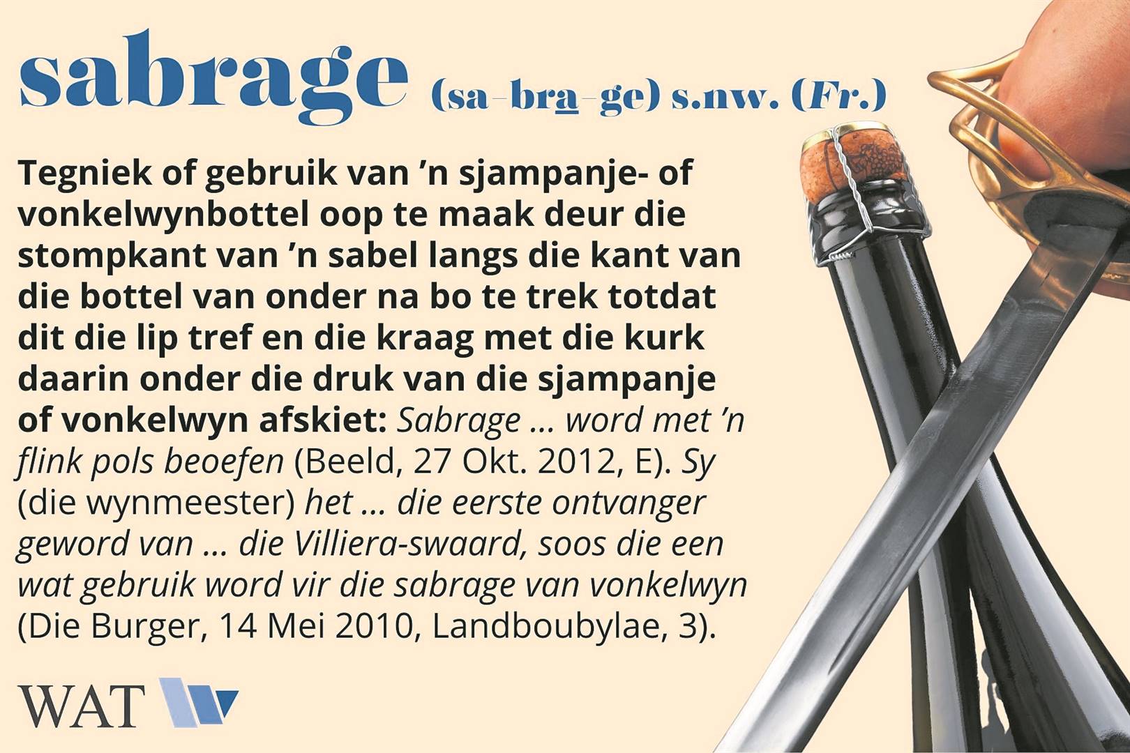 Die Woordeboek van die Afrikaanse Taal (WAT) gee ons elke week ’n kleurryke beskrywing van ongewone Afrikaanse woorde of idiomatiese uitdrukkings om jou Afrikaanse woordeskat mee op te kikker.