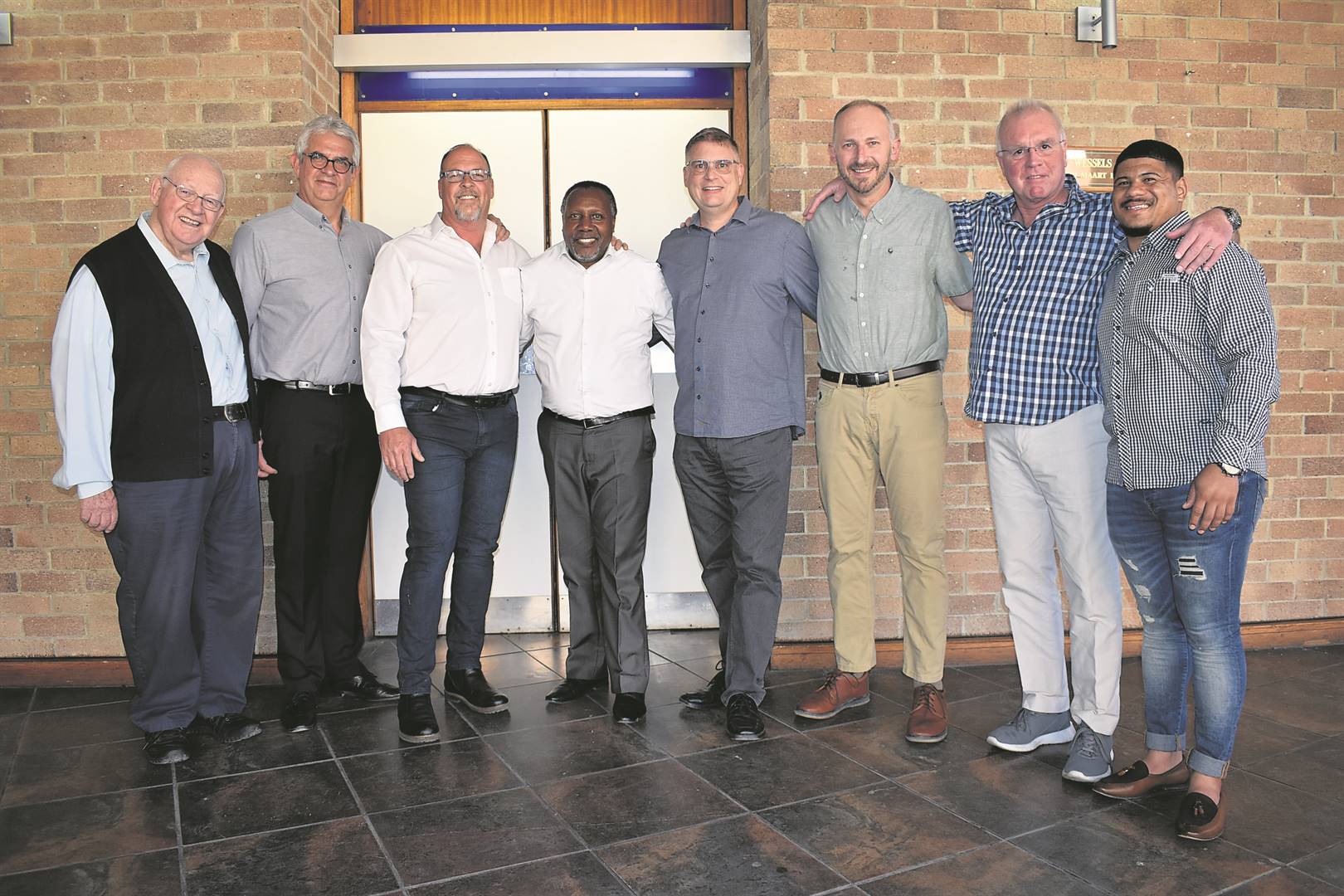 Verskeie pastore, dominees en plaaslike geestelike leiers het Sondag (20 November) ’n gebedsaksie in die Worcester-stadsaal gelei. Hulle is ds. Fanie Engelbrecht, pastoor Fritz Olivier, pastoor Blackie Swartz, pastoor Jerry Jack, Bruno Loyiso, dr. Johan Truter, pastoor Johan Schoonraad en pastoor Fredlin Weyssen. Foto: Luciano du Toit