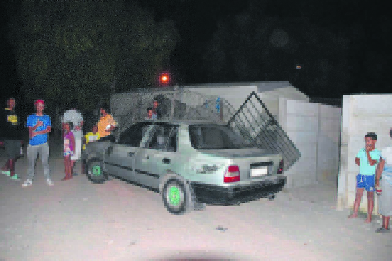 Terwyl die motor nog regop in die gesin se kamer gestaan het, het ‘n tweede motor Sondagoggend vroeg deur hul bure se beton-grensmuur gebars en in hul agterplaas tot stilstand gekom.