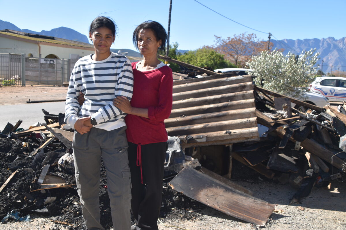 Elsabe Moyo, haar 17-jarige seun, Thabo, en Joyce en Dalian Williams het niks oor- gehou van hul besittings wat in die wendyhuise was waar hulle gewoon het nie. Hulle het twee dogtertjies, Mia (2) en Zoë (3). “Ek staan vandag hier met geleende klere aan my lyf en dit is al wat ek het. Ons slaap danksy die genade van weldoe-