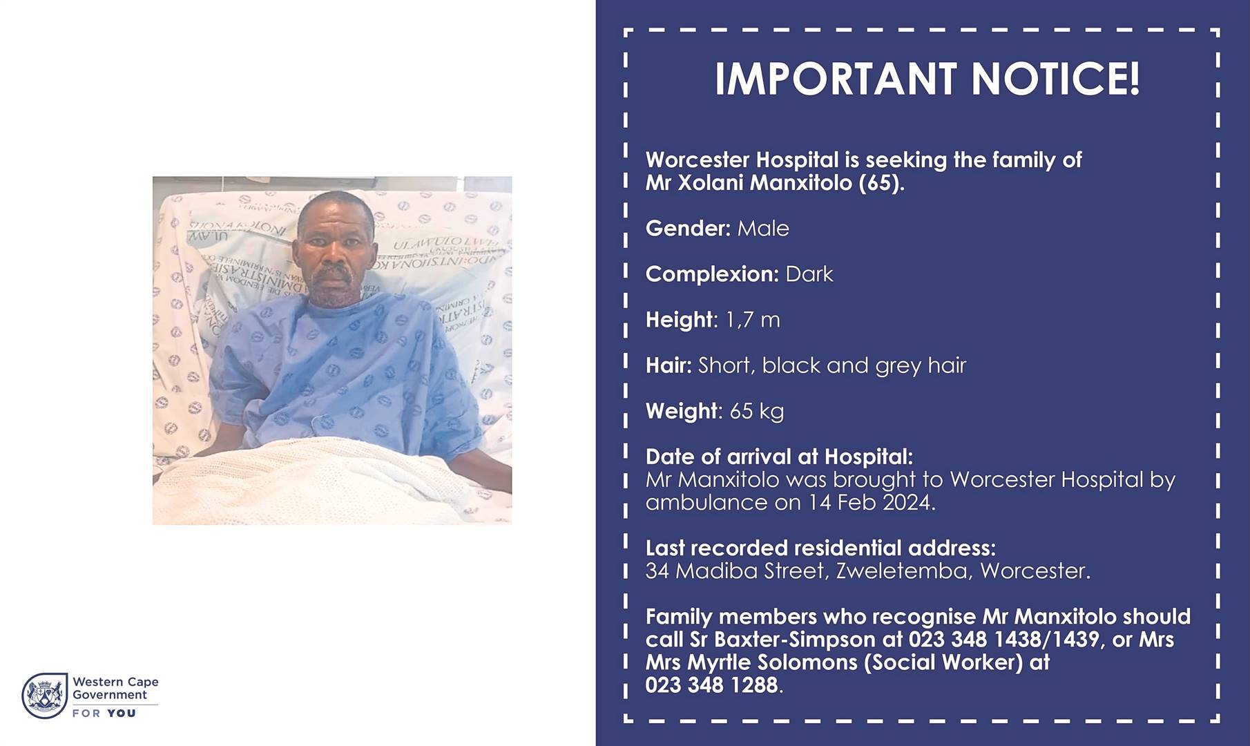 Worcester Hospital is looking for the next of kin of Xolani Manxitolo, who has been at the hospital since 14 February. Anyone with information about him is asked to contact Sr Baxter-Simpson at the hospital on 023 348 1438 or social worker Myrtle Solomons on 023 348 1288Foto: