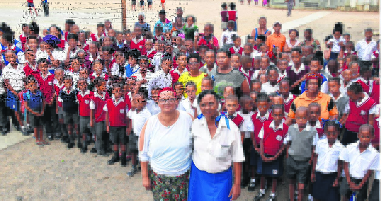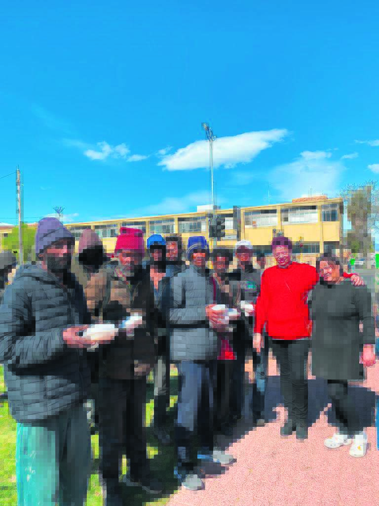 Vyf vroue uit die gemeenskap het vroeër vandeesmaand hul harte en beursies vir haweloses oopgemaak. Hulle het Sondag 3 September ’n lekker warm bord kos aan haweloses in die dorp uitgedeel. Bo staan Shirley Liebenberg (rooi hemp) saam met ’n groep by Kerkplein. Die ander vroue wat ook by hierdie inisiatief betrokke was, is Grace Juries, Imogine Abdul, Alicia Christians en Tasmin Dreyer. Foto: