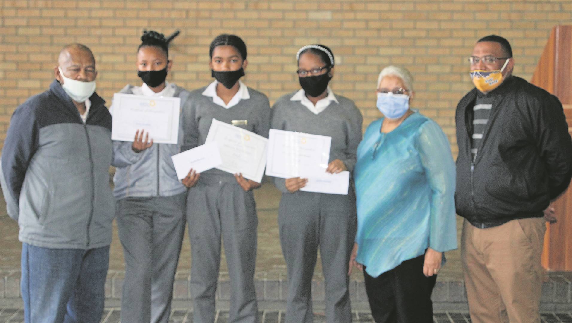 Drie leerders van Hexpark Primêr het onlangs deelgeneem aan ’n opstel-kompetisie wat deur JSETS-stokvel by die skool geborg is. Van links staan Patrick Rhode saam met die gr. 6-leerder Preslon Ambraal (3de), die graad 7-leerder Imelda Booisens (2de), die graad 7-leerder Deoniecia Lakay (1ste), Mabel Scheepers en Angelo Michaels. Foto: