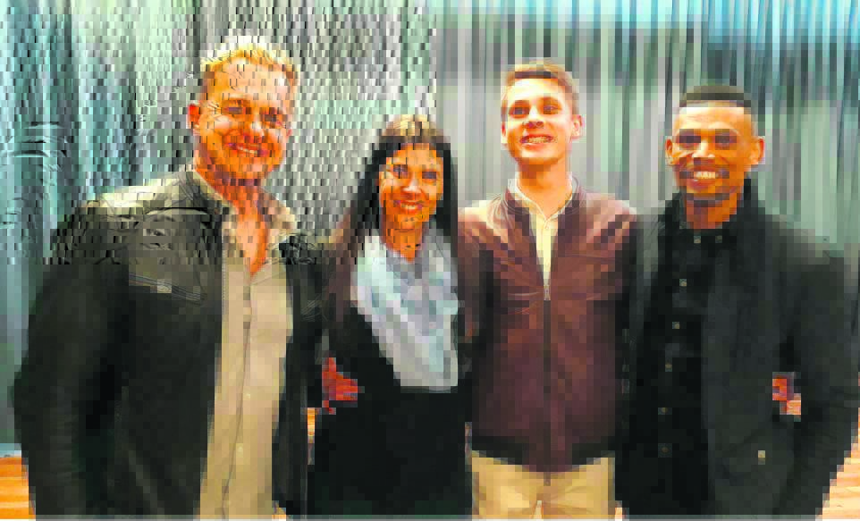 Worcester Gimnasium se jaarlikse pa-en-seun-aand, aangebied deur die hoofseun, Kyle Duvenhage (naasregs), en sy ouers, Pierre en Ilze, was ’n groot sukses. Die gasspreker, Ivor Swartz (regs) van Youth the Future, het die gaste geïnspireer met sy uitstekende praatjie en die gaskunstenaar, Heinz Winckler (links), het almal met sy puik optrede vermaak.Foto:
