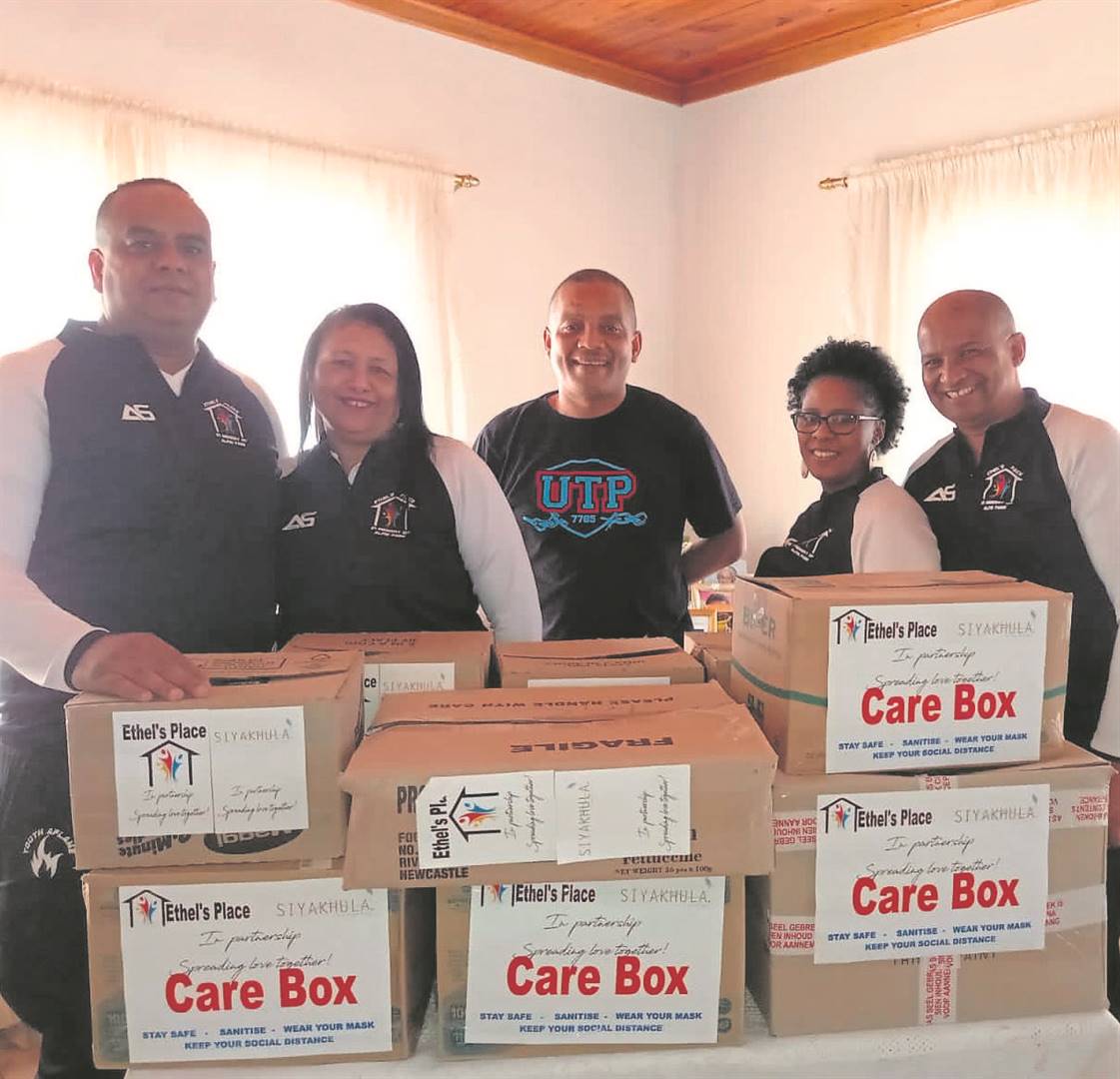 Ethel’s Place, ’n organisasie sonder winsbejag, het Saterdag 17 April in samewerking met SiyaKhula, pakkies vir Orchard Primêre Skool oorhandig. Die pakkies bevat onder meer toiletware en verskeie ander produkte om in die pandemie verligting te bring vir kinders wie se ouers finansieel swaarkry. Danver Olsen, ’n onderwyser by die skool, sê: “Ek wil graag Steve Thomas, sy vrou, Michelle, en pastoor Freddie en sy vrou, Lizette, bedank wat uit die Kaap gekom het om ons kinders te kom seën.” Links is Steve Thomas, Michelle Thomas (Ethel’s place), Danver Olsen, Lizette Matthews en past. Freddie Matthews (Ethel’s place) by die oorhandiging.Foto:
