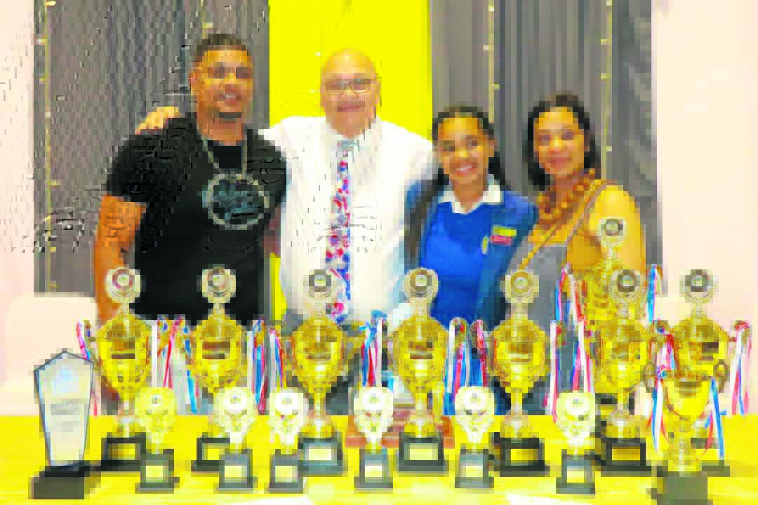 Ashantè Phillips, algehele top-leerder (dux-leerder) by Victoriapark Primêre Skool, saam met haar pa, Cuan Arendse, Ruben Titus (hoof) en haar ma, Aurelia Phillips.