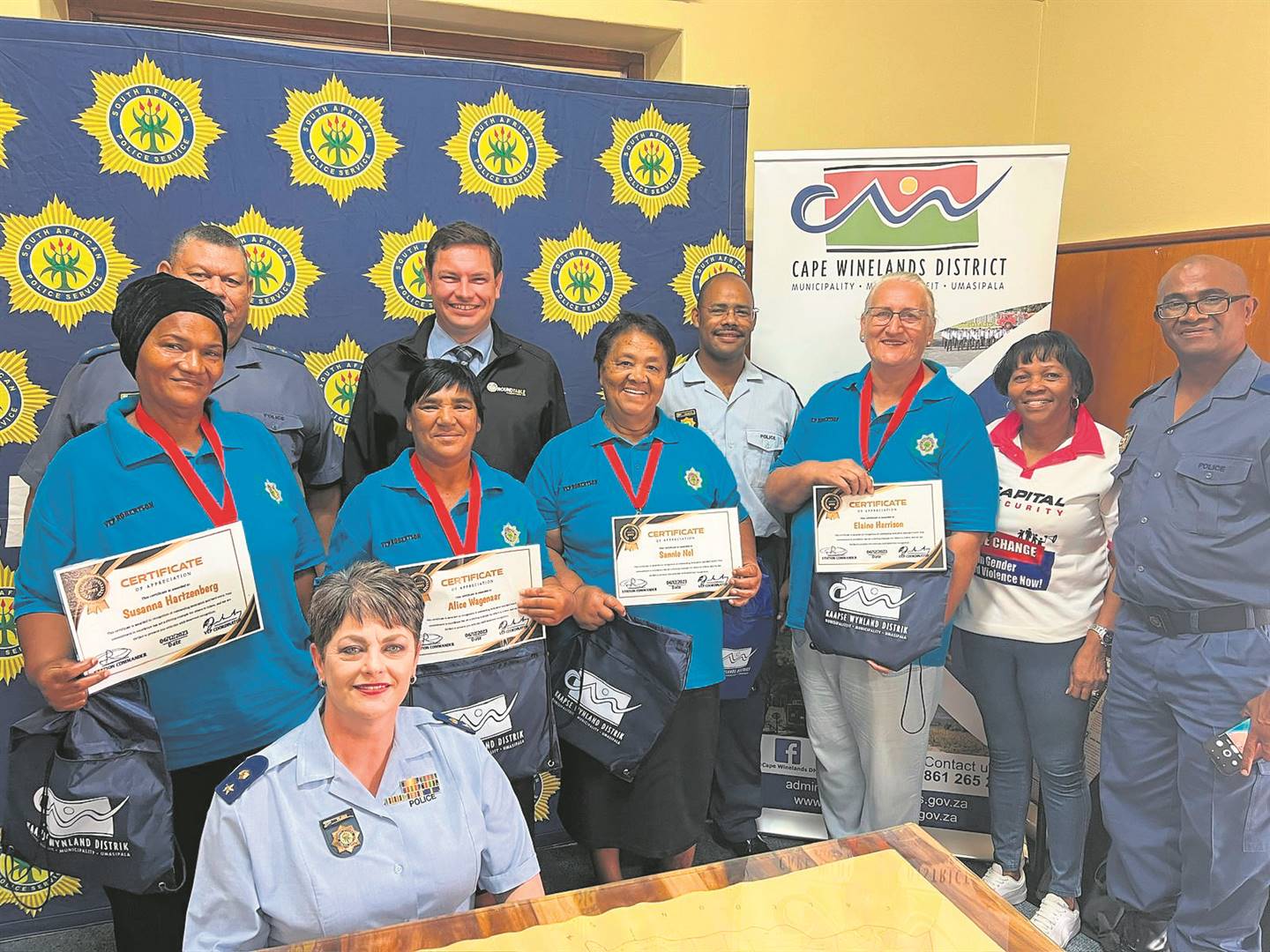 Members of the Victim Empowerment Programme (VEP) at the Robertson Police Station were awarded certificates last week. They also received medals for their loyal service during 2023. The appreciation ceremony was organised by Sgt Rudolf Valentyn and Myrtel Benjamin of the Cape Winelands District Municipality. The event also signified the closing of 16 Days of Activism of No Violence against Women and Children, and honoured and showed appreciation to the volunteers who put their own free time and family aside to assist the community in times of need.Foto: