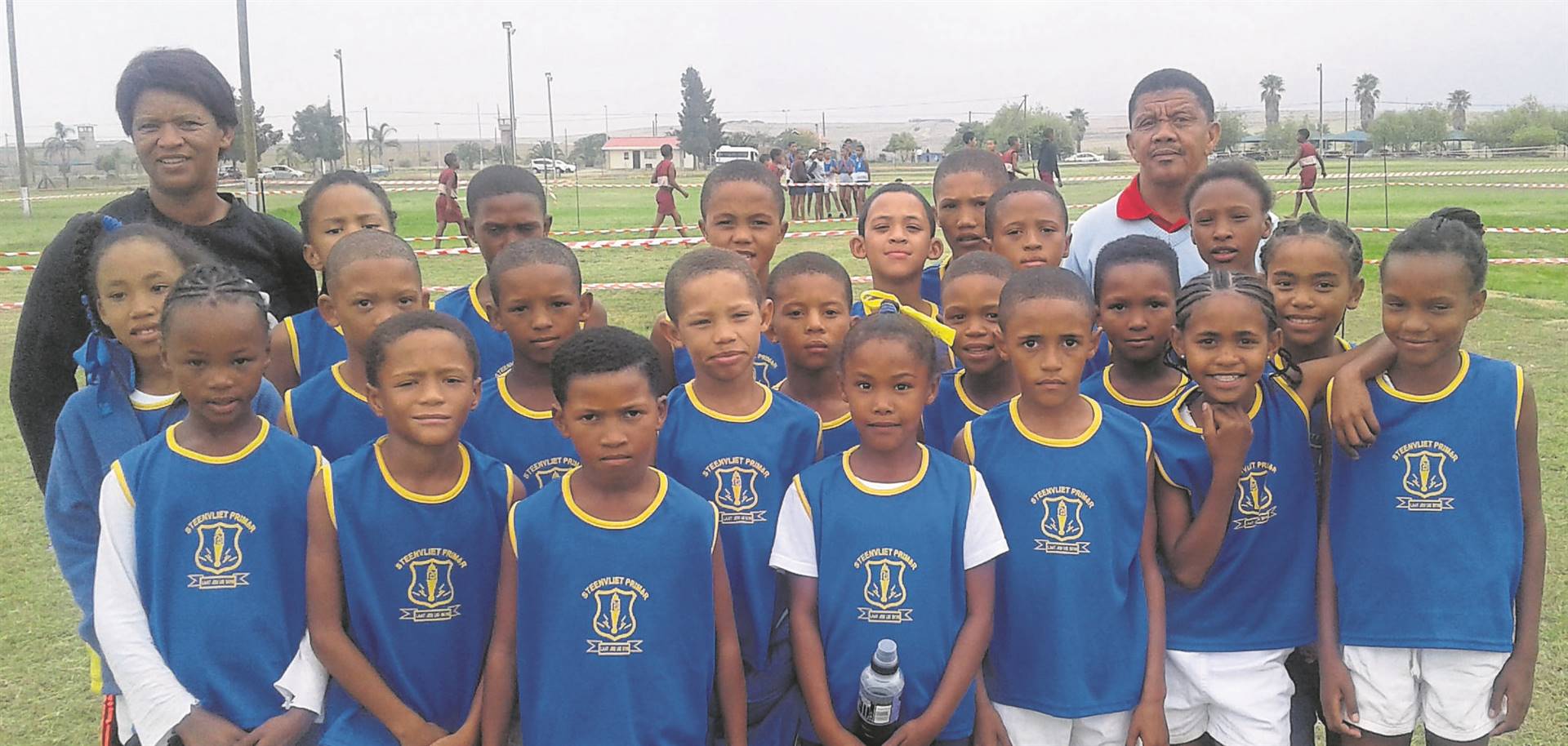 Steenvliet Primêr is trots op vanjaar se landloopspan wat hom goed van sy taak gekwyt het. Die span se afrigters, Filda Booysen (agter, links) en Petrus Karelse staan by die atlete.Foto: