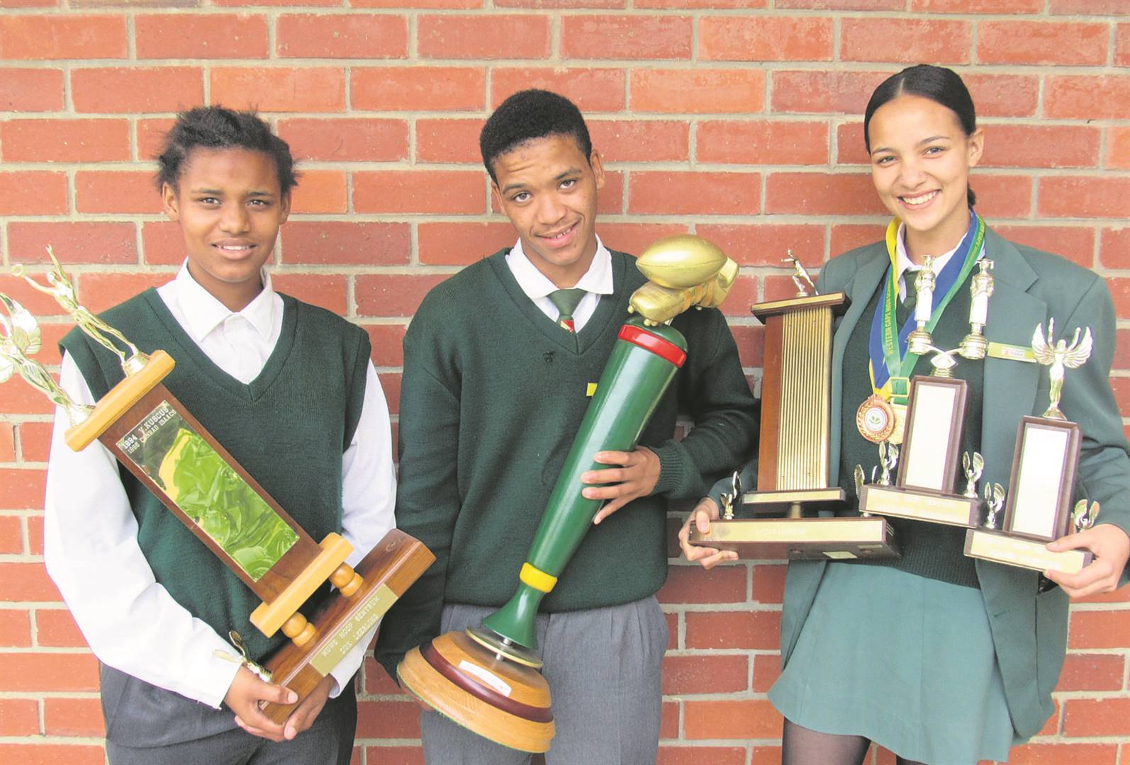 Nuwe Hoop-sentrum het onlangs sy topatlete vir die jaar aangewys. Van links is Jemima Kleinbooi (netbalspeler van die jaar), Shaun van Wyngaard (rugbyspeler van die jaar) en Andrea van Wyk (beste atleet van die jaar).Foto: