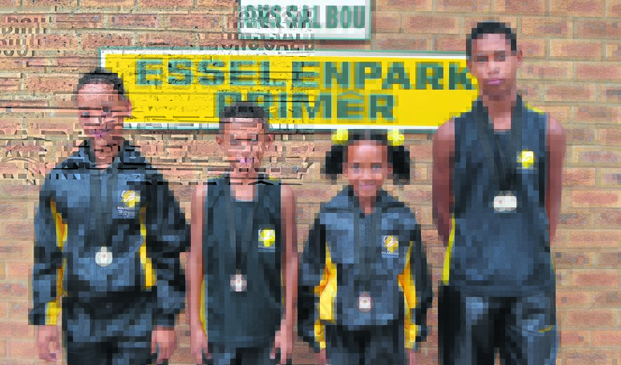 Dié spogatlete van Esselenpark Primêr het by die Noord-Boland-byeenkoms in Paarl uitgeblink en sodoende hul Boland-kleure verwerf. Van links is Raynee Fortuin, Grindan Abrahams, Miché Kammies en Caleb Isaacs. Foto: