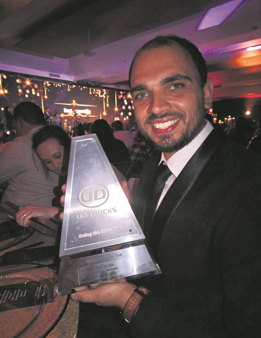 Eben du Toit (30) van Worcester is onlangs as die tegnikus van die jaar by UD Trucks Suid-Afrika se jaarlikse spog-prysuitdelings-geleentheid in Durban aangewys. Du Toit, wat al nege jaar lank by UD Trucks in Worcester werk, maar eers ’n jaar gelede as tegnikus gekwalifiseer het, het op 11 Mei as die wenner weggestap. Hy het ook ’n vakansie in Mauritius gewen en hy en sy vrou, Barbara, beplan om dié tropiese klimaat binnekort te gaan aandurf.