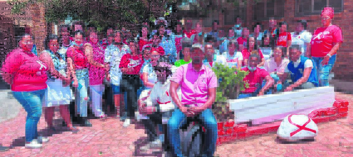 Die leerders en personeel van Worcester Sekondêre Skool het Woensdag 1 Desember ter erkenning van Wêreldvigsdag almal rooi of wit aangetrek. Die matriekleerders het ook almal rooi strikkies gekry voor hulle hul laaste eksamen geskryf het. Bo sit die groep in die skool se Vigs-tuin. Foto: