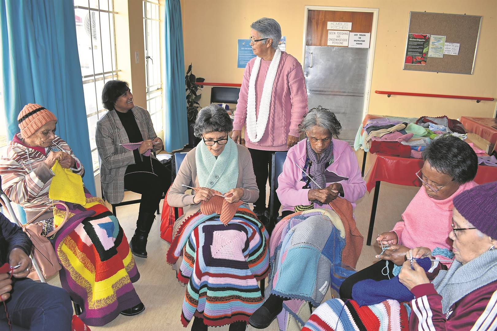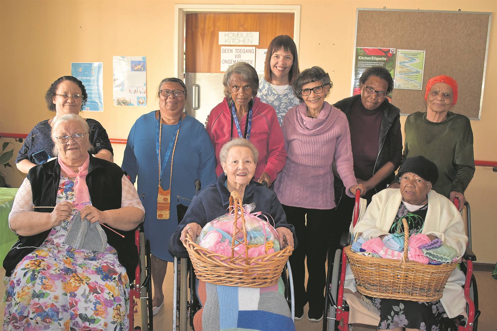 Die Golden Girls-breiers by die Awendrus-ouetehuis het Dinsdagmiddag 120 gebreide mussies vir vroeggebore babas aan die Worcester-hospitaal se dieetkundige oorhandig. Sy maak dan seker daar is altyd iets warms vir die babas. Agter staan Marelize Matthee van Worcester-hospitaal. In die middel is Leona Janses, Sharon Bailey, Salomie Barendse, Magrieta Lewis, Hilda Jonas en Anette Phillips. Voor sit Sofia Jansen, Annie Lesch en Lia Beyers. Foto: Tamsyn Jantjies