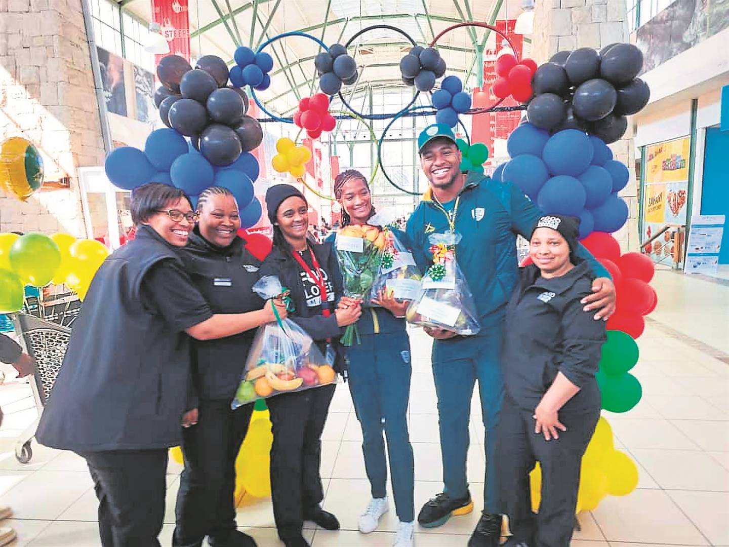 Breedevallei se Olimpiese sterre, die 400-m-hekkiesatleet Rogail Josef en die diskusgooier Francois Prinsloo, is Saterdag terug op tuisbodem in Worcester verwelkom nadat hulle die vallei se vlag by die Olimpiese Spele in Parys hoog laat wapper het. Op die foto is hulle saam met Food Lovers-personeellede in die Mountain Mill Mall wat hulle met Food Lovers-geskenkpakkies bederf het. Foto: